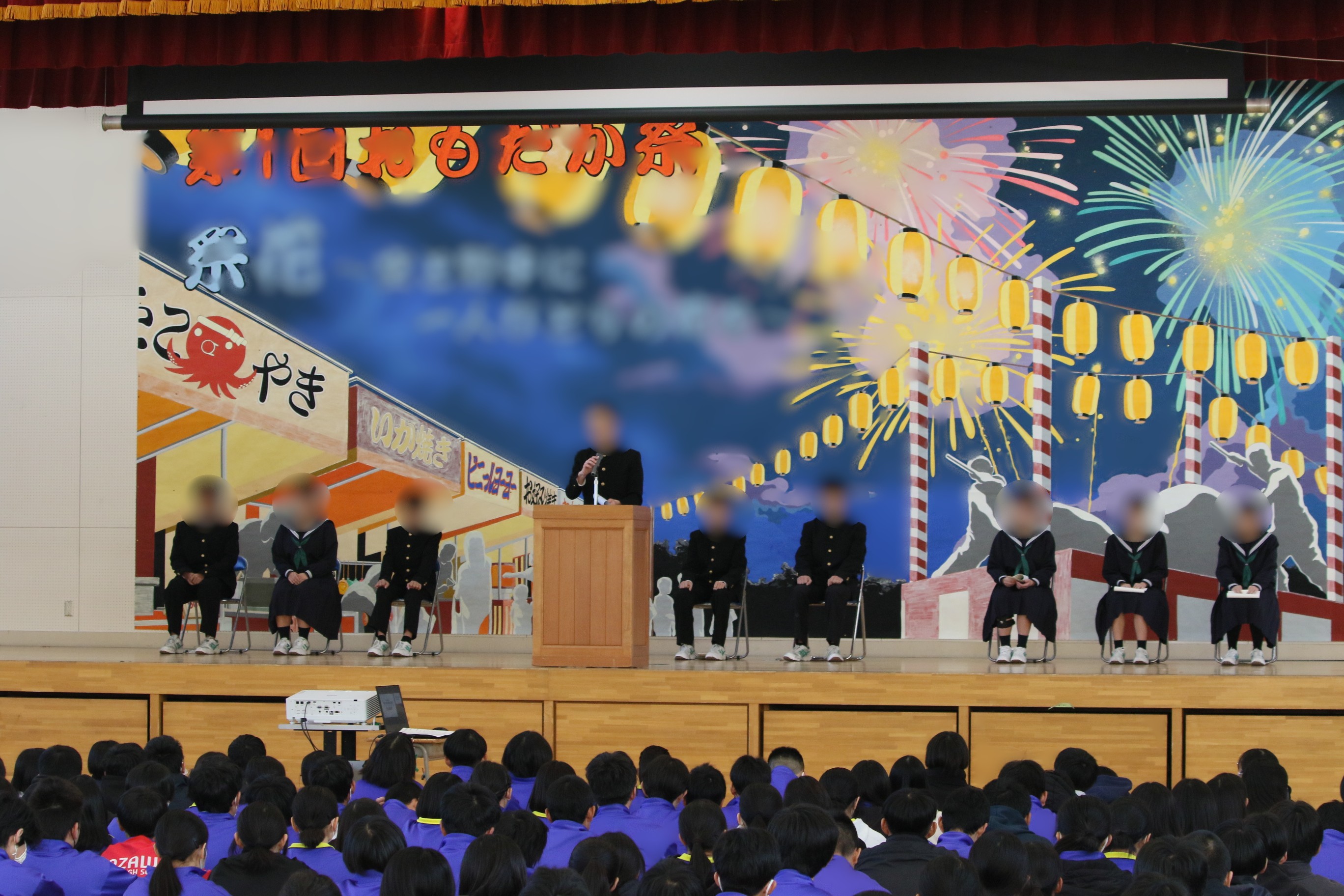 各学年の代表による意見文発表、文化部の発表、合唱コンクール、体育祭などが2日間にわたって行われます。